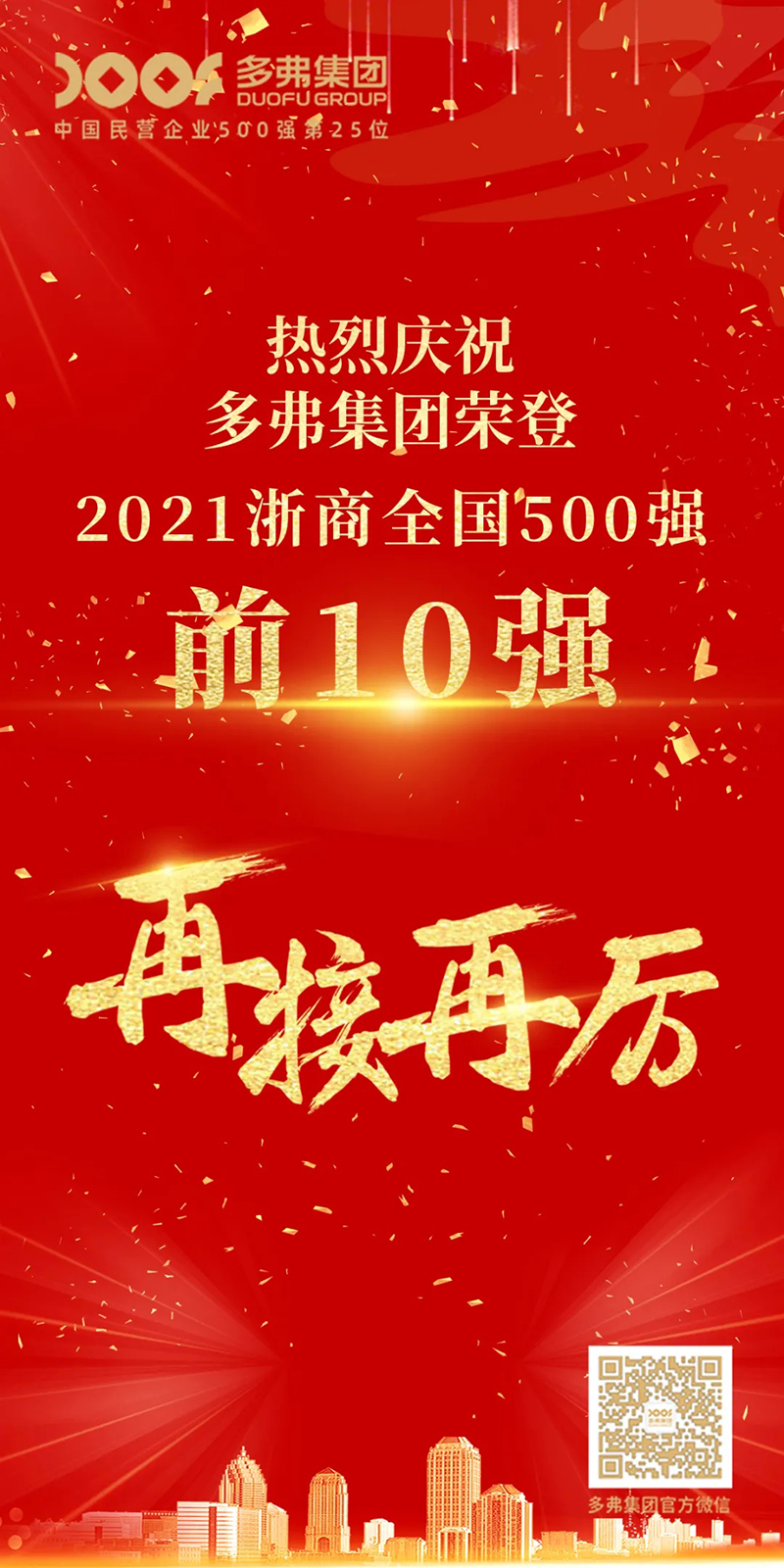 《浙商》雜志2021年8月最新一期雜志正式發(fā)布“2021浙商全國500強(qiáng)”榜單,多弗國際控股集團(tuán)進(jìn)入前十強(qiáng)。
