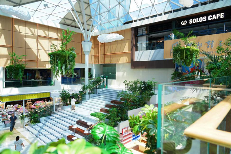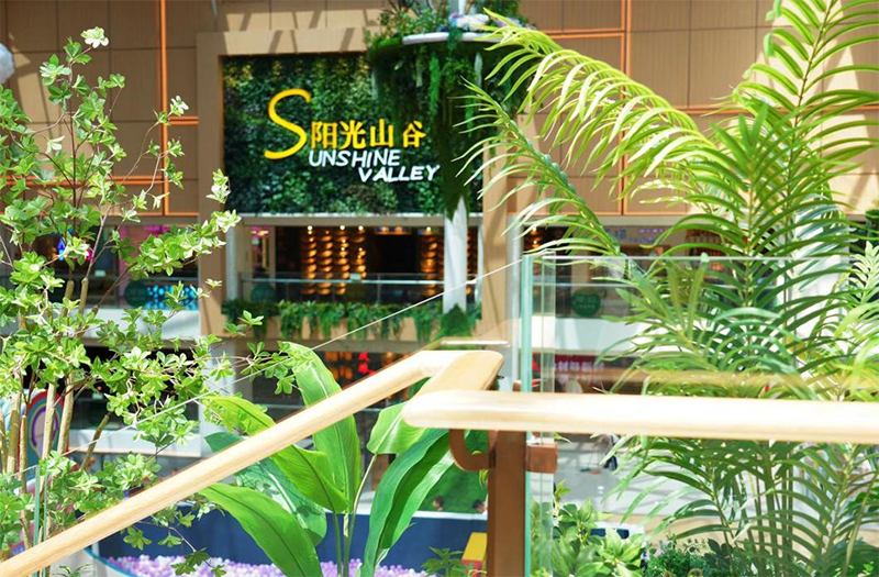 通過填補主中庭和動線調(diào)整等手段,設計團隊共打造了“云光”“藝境”“SHOW TIME” 、“陽光山谷”四大主題空間,分別對應“美妝-云光之下的時尚美學”“生活-探尋生活中的靈感意境”“潮&趣-年輕力探索中心”“藝術(shù)-綠色有機陽光山谷邂逅藝術(shù)與美食”主力場,增強了品類與空間氛圍的聯(lián)結(jié)性,使一二三期動線順暢連通,有效拉動客流向上走。其中七樓的“陽光山谷”跨層主題空間,將自然生態(tài)的綠植元素和本地的河川山谷地貌滲透其中,把自然河谷的流線設計與室內(nèi)整體動線的層次結(jié)合,增加了商場的游逛體驗。