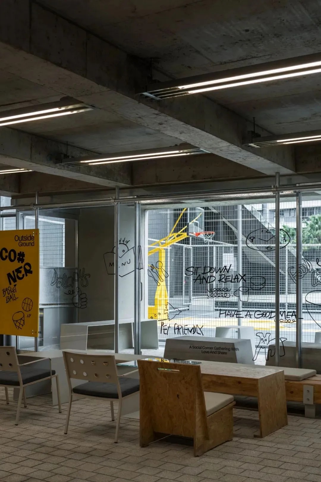 CO#NER食堂,以禁欲系冷淡風(fēng)為主旋律,設(shè)計上承襲了極致輕工業(yè)的時尚美學(xué),細(xì)膩而不失格調(diào)。其獨(dú)特的售賣模式圍繞模塊化“檔口”展開,融合POP UP快閃店概念,營造出既持續(xù)又多變的用餐氛圍,旨在為顧客解鎖無限可能的美食探索之旅??臻g內(nèi),水泥原色與暖木色家具巧妙碰撞,輔以生動活潑的簡筆插畫,色彩斑斕間傳遞出溫馨舒適的放松信號,讓人在享受美食的同時,也能感受到心靈的慰藉。