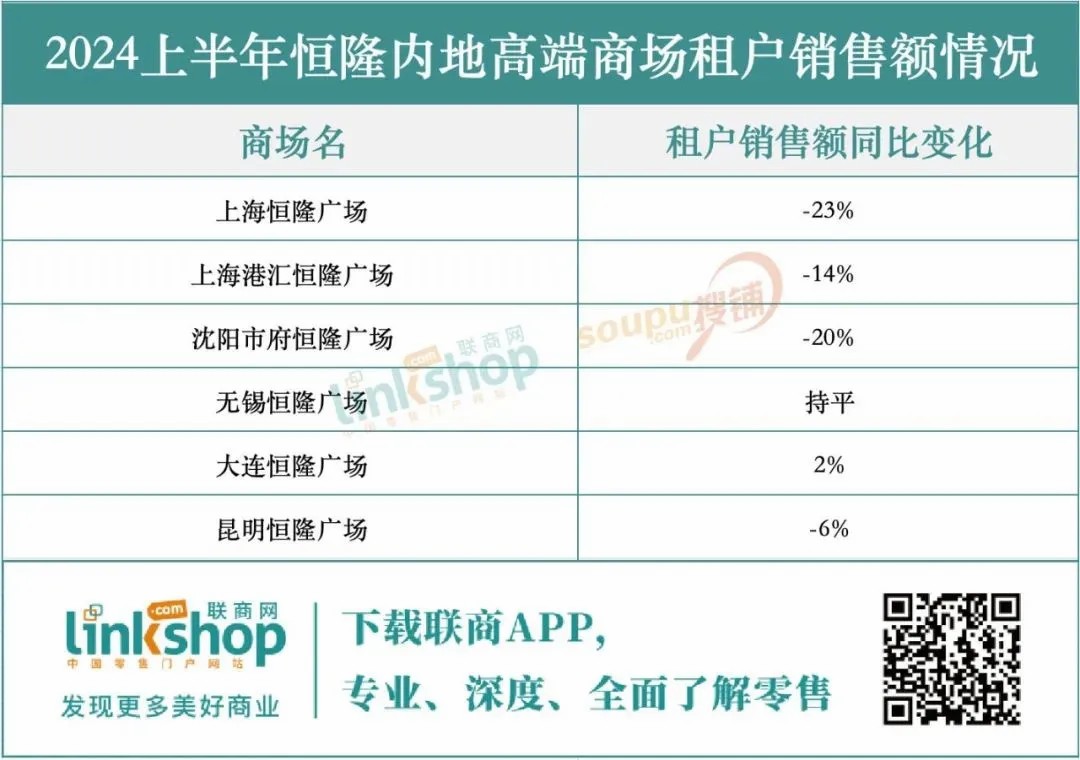 在恒隆集團(tuán)的高端商場(chǎng)中,大連恒隆廣場(chǎng)脫穎而出,實(shí)現(xiàn)業(yè)績(jī)?cè)鲩L(zhǎng),得益于其成功轉(zhuǎn)型為地區(qū)高端零售地標(biāo)并吸引高端品牌入駐。相比之下,上海港匯恒隆、沈陽(yáng)市府恒隆、昆明恒隆及武漢恒隆等四大商場(chǎng)均面臨收入和租戶銷售下滑的挑戰(zhàn),而無(wú)錫恒隆則保持業(yè)績(jī)平穩(wěn)。