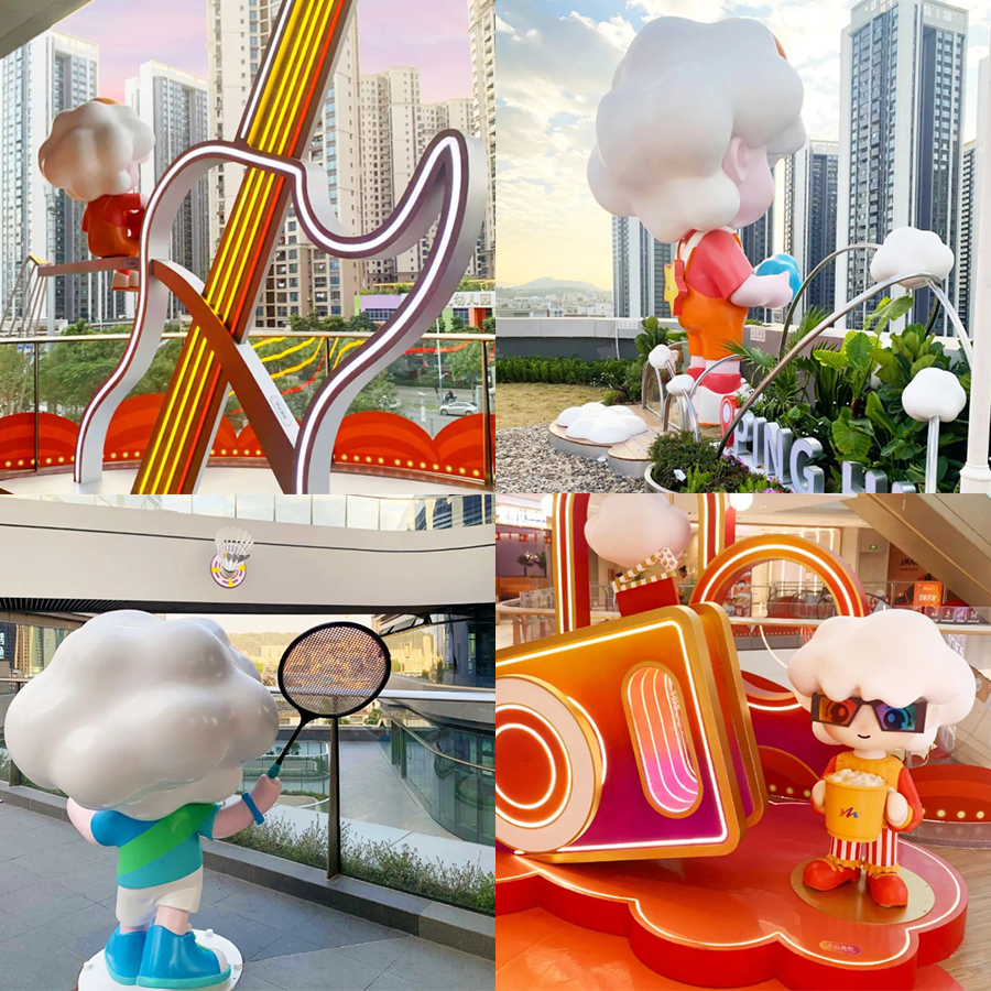 有趣的是,項(xiàng)目還推出了原創(chuàng)IP「多多」,作為項(xiàng)目與消費(fèi)者對(duì)話的符號(hào),以云朵為靈感,化身不同的角色,串聯(lián)起星空廣場(chǎng)、藝術(shù)連廊、屋頂公園等戶外空間場(chǎng)景,使獨(dú)特的記憶符號(hào)變得豐滿,憑無(wú)界創(chuàng)意加速突破商業(yè)空間界限,賦能多元互動(dòng)體驗(yàn)場(chǎng)景。