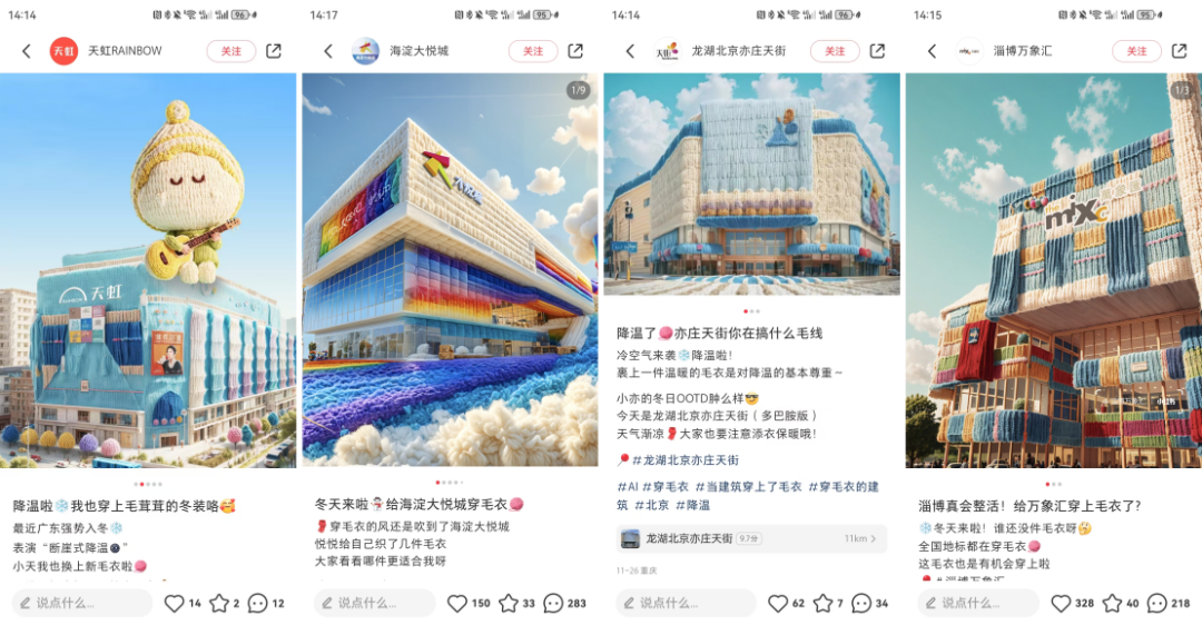 還記得今年冬天那些“穿毛衣”的購(gòu)物中心嗎?首先發(fā)布的一波AI制圖“購(gòu)物中心穿毛衣”海報(bào),確實(shí)有些以假亂真,讓很多消費(fèi)者看到了一群可可愛(ài)愛(ài)的商場(chǎng)。這些購(gòu)物中心將主形象通過(guò)“穿毛衣”這一事件變得更加擬人化,靠不同的“穿搭風(fēng)格”烘起線上平臺(tái)的話題討論熱度,也讓消費(fèi)者看到了官方的親近與真誠(chéng)。