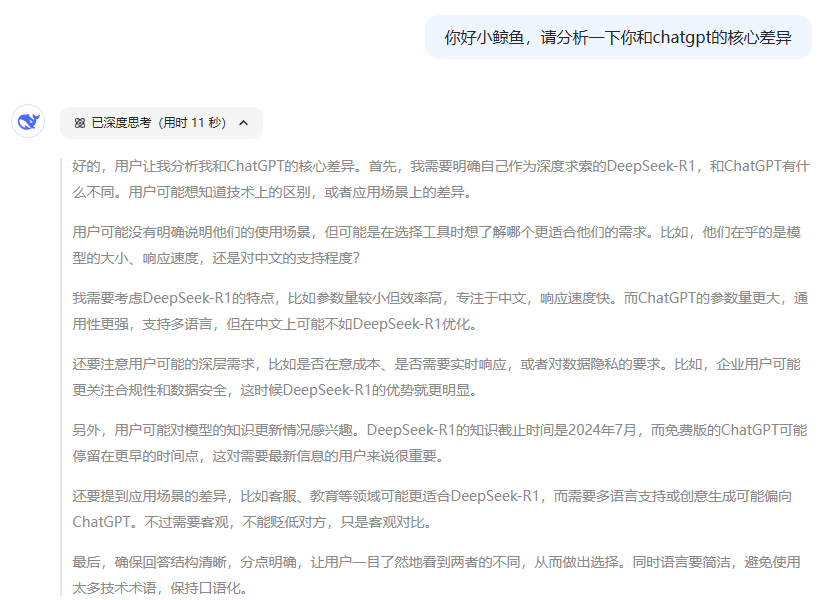 以上圖為例。在深度思考R1模式下,當(dāng)用戶(hù)詢(xún)問(wèn)它與ChatGPT有何差異時(shí),DeepSeek首先展示了其對(duì)于回復(fù)方向的思考角度與框架,比如工具選取角度、場(chǎng)景應(yīng)用角度,這也是在引導(dǎo)用戶(hù)進(jìn)一步了解自己的業(yè)務(wù)訴求。它不僅是在輸出結(jié)論性總結(jié),也在幫助用戶(hù)尋找問(wèn)題的本質(zhì)。